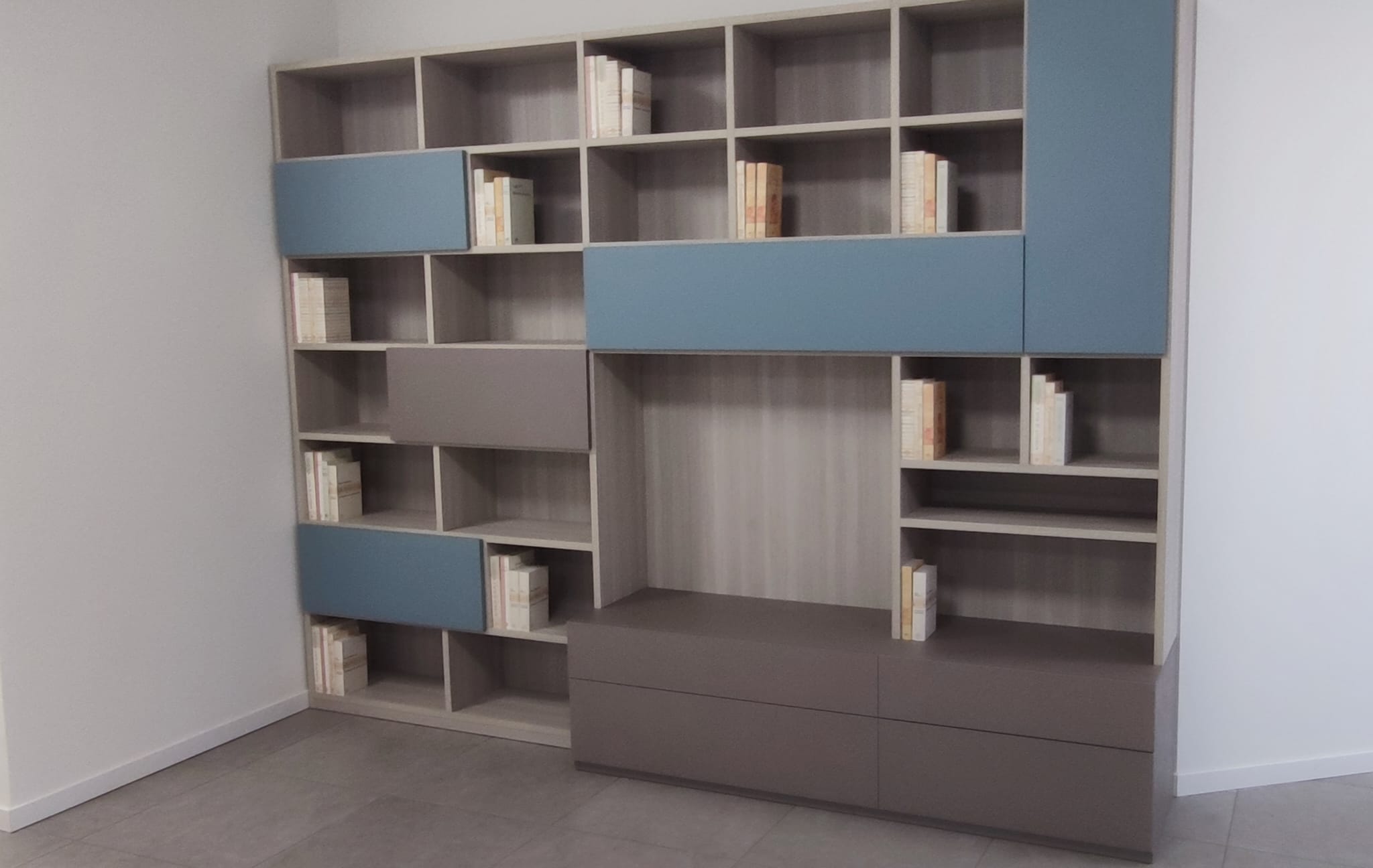 Libreria bifacciale laccata e rovere moro
